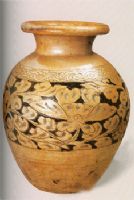 大卷沿,直領(lǐng)。三道弦紋將紋飾分劃成兩組。肩部一匝刻劃卷云紋。紋飾自然、流暢。腹部一周剔花填黑彩牡丹花紋。