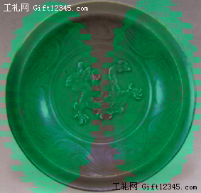 這塊殘瓷外腹壁刻菊瓣紋,內(nèi)心坦底貼雕龍頭鳳尾紋及繡球,蒼龍及繡球皆系同瓷盤坯泥片堆貼后,作雕、刻、劃、剔等,使紋飾高于胎體,掛釉后營(yíng)造了紋飾玉質(zhì)釉彩下,映現(xiàn)出浮雕效應(yīng),燒成之器物清純流翠、釉色瑩潤(rùn)、紋飾俏麗。