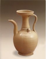 此壺是北宋早期龍泉窯的產品。四組暗刻瓜稜將壺身分為四等分。壺肩飾有雙系,長而細的流和手柄配合協(xié)調,頭部配有盤狀大口。