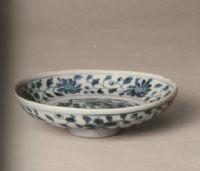 此盤斂口,圓唇,淺腹,矮圈足不施釉。胎質(zhì)白而細膩。盤內(nèi)外壁均繪六朵纏枝菊紋,菊瓣和菊葉大小相仿,菊紋上下各有弦線相隔。