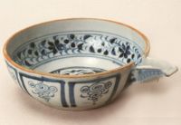 匜是西周、春秋時流行的輿洗用具。這件瓷匜形似瓢,圓形,有流,流下有一小環(huán)鈕。內(nèi)底繪青花束蓮紋,內(nèi)壁繪一周花卉。