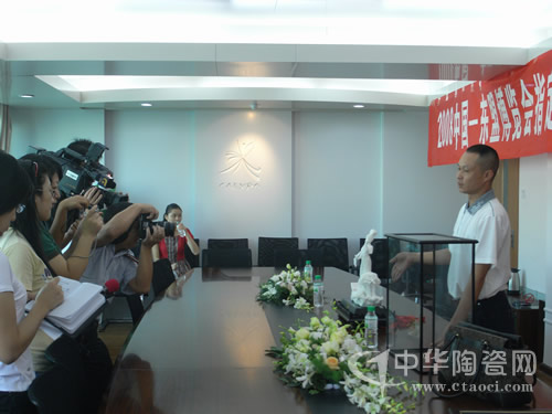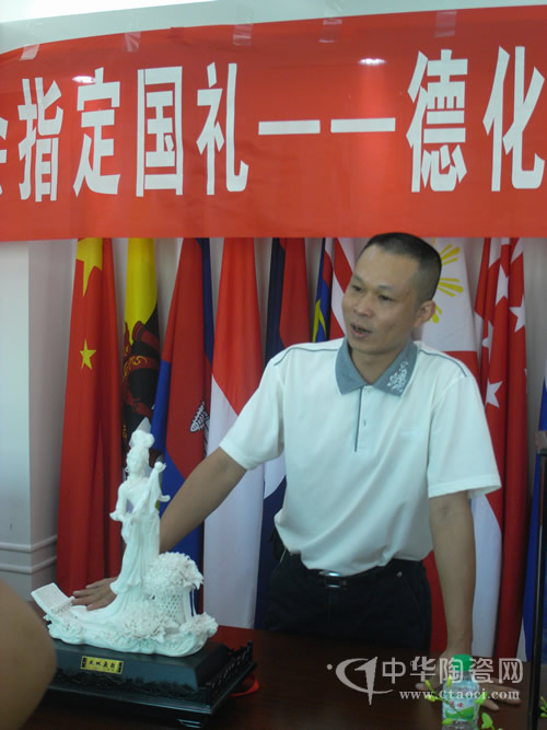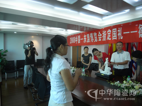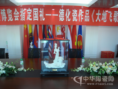 中華陶瓷網訊,10月17日第六屆中國-東盟博覽會秘書處舉行“2008中國—東盟博覽會指定國禮——德化瓷作品《大地飛歌》交接儀式”,由德化云姿陶瓷有限公司總經理,工藝美術大師蘇志強創(chuàng)作的《大地飛歌》被定為2008中國—東盟博覽會指定國禮,贈送前來參加第五屆中國--東盟博覽會的東盟各國官員。
