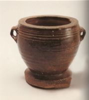 罐作斂口,平唇,簡(jiǎn)腹向下內(nèi)收,平底。器型特殊,腹上部對(duì)稱地置有兩耳,并飾弦紋三道。施黑釉,毗近底部露胎,罐放置在一圓形瓷質(zhì)墊座上,墊座四周劃飾斜直線。