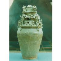 器物上部堆塑有樓臺亭闕,人物百戲,飛禽走獸.盤上有龜趺,刻有"元康元年八月二日會稽上虞"字樣,罐腹上堆貼有鋪獸銜環(huán),對風(fēng),辟邪,騎士及動物圖案,器體瘦長,釉色青淡,胎釉結(jié)合欠佳.