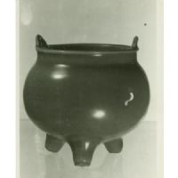口微侈,口沿上置有兩對(duì)稱豎耳,短頸,腹近球形,底承三乳足,足底露赭紅色胎,內(nèi)底有三小孔,釉色粉青,精光內(nèi)蘊(yùn),總體造型端莊而渾厚.