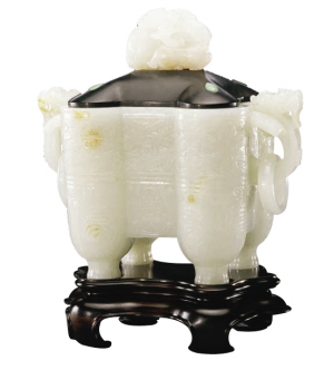 玉器部分的“清乾隆白玉獸耳活環(huán)仿古四足爐”是此類拍品的點(diǎn)睛之筆,玉質(zhì)潤(rùn)潔,拋光精細(xì),雕工細(xì)膩,端莊典雅,可稱之為乾隆玉器的代表作品。