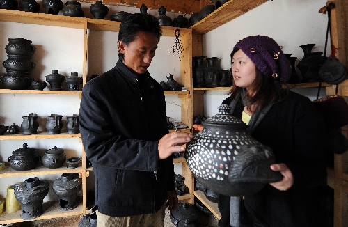 10月27日,尼西鄉(xiāng)湯堆黑土陶手工藝人當(dāng)珍批初(左)在自家店鋪中向客人介紹黑土陶的特點(diǎn)。 近年來(lái),云南省迪慶藏族自治州香格里拉縣尼西鄉(xiāng)利用良好的自然條件及特有的傳統(tǒng)手工藝技術(shù),積極發(fā)展生態(tài)雞養(yǎng)殖與黑土陶燒制等特色產(chǎn)業(yè),使“尼西雞”和“尼西黑土陶”成為云南省的知名特色產(chǎn)品,讓已參與其中的500多戶農(nóng)戶每戶每年增收超過(guò)萬(wàn)元,有效推動(dòng)了當(dāng)?shù)匾恍┎刈迦罕姷拿撠氈赂弧?/p>