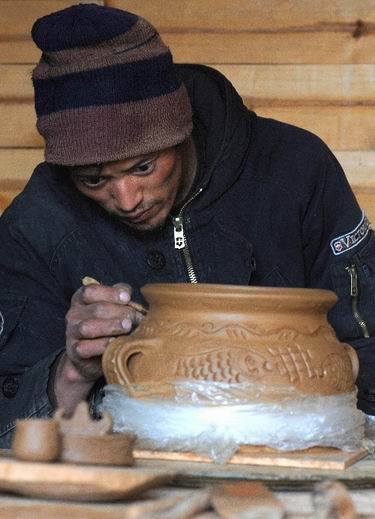 10月27日,尼西鄉(xiāng)湯堆的一位手工藝人正在制作黑土陶器皿。 近年來(lái),云南省迪慶藏族自治州香格里拉縣尼西鄉(xiāng)利用良好的自然條件及特有的傳統(tǒng)手工藝技術(shù),積極發(fā)展生態(tài)雞養(yǎng)殖與黑土陶燒制等特色產(chǎn)業(yè),使“尼西雞”和“尼西黑土陶”成為云南省的知名特色產(chǎn)品,讓已參與其中的500多戶農(nóng)戶每戶每年增收超過(guò)萬(wàn)元,有效推動(dòng)了當(dāng)?shù)匾恍┎刈迦罕姷拿撠氈赂弧?/p>