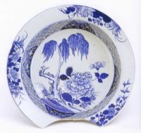 盆折沿,深腹,平底,折沿口上青花繪荷花、牡丹,盆中心主題紋飾為垂柳、牡丹。此盆造型規(guī)整,紋飾雍容華貴,是外銷瓷中的精品。