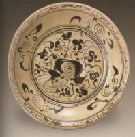 口外撇,弧形淺腹,圈足。胎體較厚重,胎色閃灰。通體紋樣系在白色化妝土上用黑彩繪畫而成,紋樣雖較為草率,但不乏生動流暢之感。