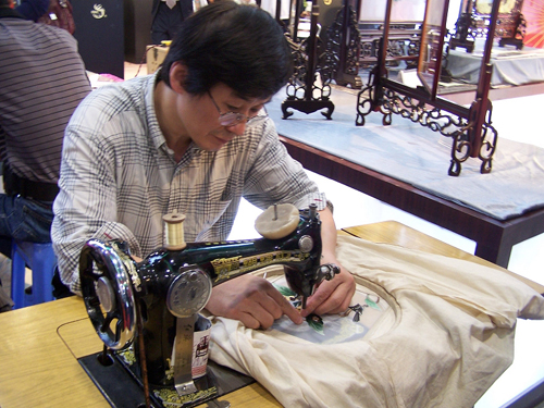 刺繡大師搬來老牌縫紉機(jī)繡起仕女圖