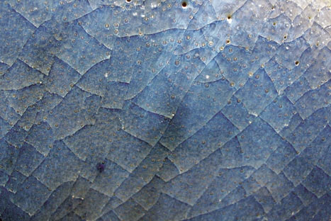 鈞窯瓷器的釉中一般都有大小如針孔的稀疏大氣泡,以及由中小氣泡組成的氣泡群,各氣泡雖然大小不一,比較稀疏,但各氣泡間的距離大體均勻。鈞窯瓷器的氣泡,在器物全身的分布并不完全一致,而是有的部位較明顯,有的部位卻不明顯,也有的鈞窯器物通體都無(wú)明顯的氣泡(圖2、金代鈞窯標(biāo)本釉面氣泡;圖3、北宋鈞窯月白釉紫斑碗)。