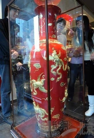 這是消費(fèi)者在觀看千窯一寶“富貴紅”大花瓶(11月14日攝)。
