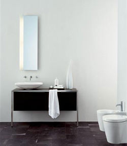 衛(wèi)浴的色調(diào)以黑白灰為主。墻面灰色的亞光瓷磚中間,因?yàn)橘N了一道西德石雕花墻磚,使單調(diào)的墻變得豐富起來,在整體視覺上讓人感覺很舒服。
