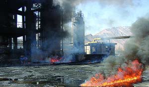 火勢(shì)剛得以控制,距廠房500米處又升起了濃煙。走近一看,原來(lái)有幾名工人正在焚燒院內(nèi)枯草。“原本打算將枯草就地點(diǎn)燃,現(xiàn)在廠房著火了,我們就割下來(lái)放到垃圾箱里燒。”一位工人說(shuō)?吹酱饲榇司埃_市公安消防支隊(duì)有關(guān)負(fù)責(zé)人說(shuō),地上有煤焦油和液化氣的混合物,一不小心火苗就能引燃它們,這樣燒枯草,安全隱患很大,工人的消防意識(shí)很淡薄。