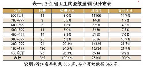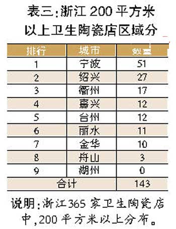 從陶瓷店數(shù)量/面積分布表可以看出(見表一),參與調(diào)查的365家衛(wèi)浴陶瓷店中,200平方米以上陶瓷店數(shù)量占比40%,面積占比則達(dá)到近70%,而800平方米以上陶瓷店共有11家,主要分布在寧波、紹興和衢州。