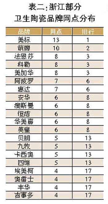 從衛(wèi)浴品牌的分布來看(見表二),美標(biāo)、科勒、卡西奧、漢斯格雅等國(guó)際品牌在浙江地級(jí)市場(chǎng)的力度明顯加大,美標(biāo)超過箭牌3個(gè)網(wǎng)點(diǎn)的數(shù)量而躍居第一,分布在金華、寧波、麗水、紹興、臺(tái)州等地級(jí)市場(chǎng)。