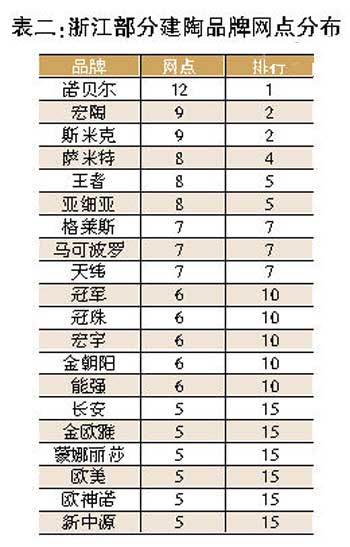 作為浙江本地品牌,諾貝爾在自己的家門口以絕對優(yōu)勢壓過其它品牌而位居網(wǎng)點排行的首位。而上海品牌斯米克、亞細亞也打破在其它地區(qū)的尷尬境地,在浙江的二、三級市場嶄露頭角,與佛山品牌一決高下。