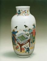 口微撇,短頸,燈籠形腹,圈足。通體白釉上繪粉彩紋飾。頸部粉彩繪琴棋書畫博古圖,腹部以粉彩繪兩仕女圍桌對弈圖。所繪仕女均長臉高髻,一手持圍棋,一手相持,神態(tài)悠閑專注。棋桌旁有兩幼童正在玩耍,案幾、樹石等景物均以工筆表現(xiàn),色彩濃淡有致。