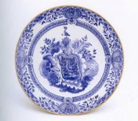 釉下青花,醬口,邊緣有羅柯柯花紋,以錦地劃隔四朵花卉,盤(pán)心內(nèi)飾以花草云朵,中心畫(huà)以瑞典市民格雷(從未被寺為貴族)的紋章。