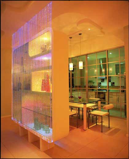 展示架也非常適合用來劃分客廳和餐廳空間。在這個案例中,充滿時尚、動感造型的展示架不著痕跡地發(fā)揮著自己的分隔作用,同時,又能與被分開的兩個空間完美融合,不顯突兀。為了增強(qiáng)裝飾效果,帶有發(fā)光效果的線簾也被運(yùn)用了進(jìn)來,讓這處空間充滿了設(shè)計感,顯得新穎而獨(dú)特。