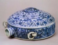 壺直口,細(xì)頸,一面扁平,砂底無(wú)釉,中心凹入一圈,一面隆起,中心拱出,肩上有雙活環(huán),頸部飾凸弦紋。通體青花紋飾,中心飾水波紋,其外圍及器壁飾纏枝花卉紋,頸飾朵花及纏枝花卉紋。此器造型源自阿拉伯銅器。