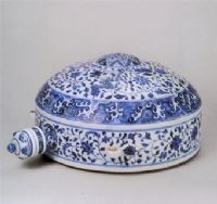 壺直口,一面扁平,中心凹進(jìn),一面隆起,隆起面中心有凸臍。蓋圓頂,寶珠鈕。通體青花紋飾,凸臍繪海水江崖地八角錦紋,其內(nèi)飾纏枝花紋,中心四周繪纏枝花紋,外環(huán)以海水紋,壺壁側(cè)繪纏枝蓮紋。
