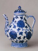壺似梨形,圈足。彎流,弧形柄。蓋拱頂,寶珠鈕。通體青花紋飾,腹飾纏枝牡丹紋,流與柄及足墻飾忍冬紋,蓋頂飾變形蓮瓣紋。