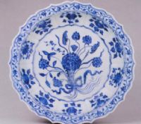 盤菱花口。青花紋飾,盤心飾束蓮紋,里外壁均飾折枝花紋,折沿飾纏枝花卉紋。外口沿下青花橫書“大明宣德年制”六字楷書款。此盤里心紋飾又稱“把蓮紋”,是宣德瓷器上獨(dú)具特色的裝飾。此器是宣德時(shí)典型器。
