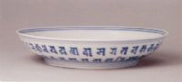 盤敞口,弧壁,圈足。青花紋飾,中心書梵文十輪金剛咒;周圍環(huán)飾蓮瓣紋,內(nèi)分別書梵文六字真言,外壁青花書梵文吉祥咒兩行,底青花雙圈內(nèi)書“大明成化年制”六字楷書款。
