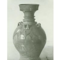 小盤口,長(zhǎng)頸,上有二凸輪.溜肩,鼓腹,下腹斜收為小平底.器身肩腹處刻劃有重覆蓮.釉色淡青,開片.較為典型的甌窯產(chǎn)品.