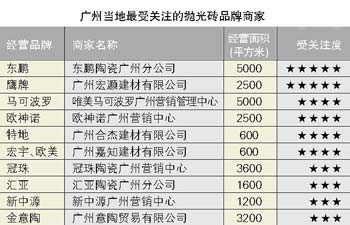 在廣州市場,各種拋光磚品牌均有入駐,品牌專賣店超過500家,拋光磚商家數(shù)量占整個市場的90%左右,主要集中在花花世界陶瓷館、五洲裝飾市場、安華裝飾市場和喜龍建材市場等。