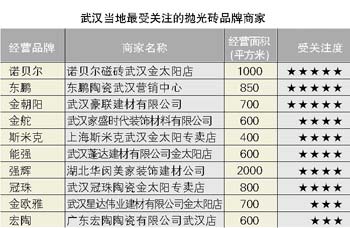 武漢的大部分商家熱衷于經(jīng)營具有一定知名度的拋光磚品牌。市場上比較活躍的拋光磚品牌有諾貝爾、東鵬、金朝陽、金舵、斯米克、薩米特、能強、強輝、金歐雅等。當(dāng)?shù)厥袌錾辖?jīng)營拋光磚的商家占建筑陶瓷商戶的近90%。其中比較有影響力的品牌和商戶主要集中在金太陽建材廣場、漢西貨場、時代建材精品城、康家建材廣場和宜家建材廣場等地。