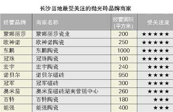 長沙市仿古風(fēng)漸起,除去工程以外,拋光磚和仿古磚的市場比例大概是4:6。在長沙地區(qū),國內(nèi)的拋光磚品牌幾乎都有入駐,主要品牌有L&D、歐神諾、蒙娜麗莎、宏宇、百特、東鵬、信和、百思特、德冠、奧米茄、長航、格萊斯、諾貝爾等,經(jīng)營拋光磚的商家總共有620家,主要集中在馬王堆陶瓷建材城和瑞祥陶瓷市場,有225家,占總商家數(shù)量的36.3%。在消費水平比較高,而收入較低的長沙,消費者更看重的是價格和質(zhì)量,性價比高的中高檔品牌比較受歡迎。