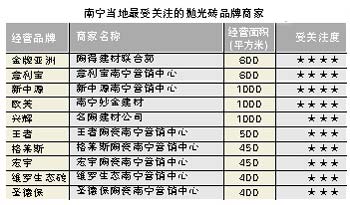廣西南寧市6大建材市場聚集了國內(nèi)各中高品牌的拋光磚。目前,南寧市經(jīng)營拋光磚的商家約650家,占陶瓷商家的90%,主要集中在南寧市快環(huán)、明秀、虎邱、廣西、富安居和萬泰隆建材市場,在每個建材市場內(nèi),拋光磚商戶幾乎都占多數(shù)。適應(yīng)于南寧整體消費水平的中檔拋光磚最為暢銷,價格仍是消費者考慮的首要因素。在同一檔次的品牌面前,消費者往往看重產(chǎn)品的價格,其次是花色。