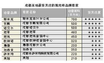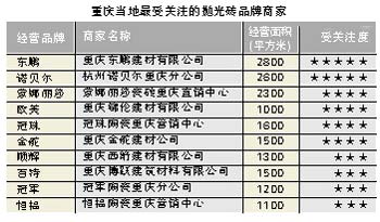 重慶的拋光磚品牌主要有東鵬陶瓷、金舵陶瓷、蒙娜麗莎陶瓷、冠珠陶瓷、諾貝爾陶瓷、歐美陶瓷、順輝陶瓷、冠軍陶瓷、歐神諾陶瓷、宏宇陶瓷、斯米克陶瓷、格萊斯陶瓷、百特陶瓷、恒福陶瓷、加西亞陶瓷、建輝陶瓷、鷹牌陶瓷、新潤(rùn)成陶瓷、巴丹陶瓷、樵東陶瓷、合美陶瓷等。經(jīng)營(yíng)拋光磚的商家約有560家左右,占到總建筑陶瓷商戶數(shù)量的65%左右。重慶的消費(fèi)水平中等偏低,但在逐步提升,中檔拋光磚較受消費(fèi)者歡迎。重慶消費(fèi)者購(gòu)買(mǎi)陶瓷已日趨理性,買(mǎi)磁磚時(shí)一般都抱著“適合自己就是最好”的心態(tài)。