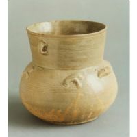敞口,直頸,扁圓形鼓腹,平底。頸部置對(duì)稱雙系,腹部塑飾蟾蜍頭和四肢,口沿飾四處等距褐斑點(diǎn)彩。