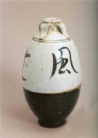 小口,短頸,附四系,卵圓腹,圈足。腹上部施白釉,并有黑彩草書[風(fēng)花雪月]四字。腹下部施黑釉。此瓶是北方磁州窯系宋、金兩代常見的器物,其造型端莊,裝飾簡(jiǎn)潔而大方,腹部四字吉祥語,反映了當(dāng)時(shí)人們一定的思想意識(shí)。