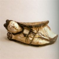 枕整體雕塑一童子側(cè)臥于圓枕之上,安然入睡。枕面如意云頭形,覆蓋童子身體。通體白釉褐黑彩彩繪,童子頭梳雙髻,雙手合攏,懷抱書卷,眉清目秀,一臉稚氣,姿態(tài)自然優(yōu)雅。