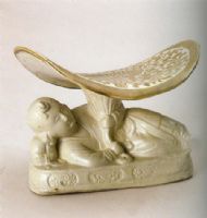 淺灰白色瓷胎堅(jiān)而細(xì),施牙黃色釉。枕座為一模塑的胖孩童側(cè)臥在榻上,雙手緊抱巨葉蓮埂,葉大
