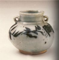 唇口,短頸,圓腹,平底,底露胎,頸、肩間有圓形雙系一對。通體籬青白色釉,器腹釉下繪青花花草紋一周,青花筆繪隨意,色澤呈藍黑色。此類造型作品,較多出土于東面亞地區(qū),系元代貿(mào)易瓷器。