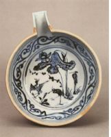 口內(nèi)斂,淺腹微鼓,無(wú)釉平底,口邊有槽,槽口外彎。內(nèi)外繪青花,色澤灰黑。內(nèi)壁繪卷草紋一周,內(nèi)心主體紋飾為蓮塘鷺鳥(niǎo)紋,三雙鷺鷥姿態(tài)各異,頗有生趣,外壁繪仰蓮紋一周。