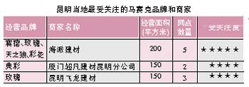 昆明市專業(yè)經(jīng)營馬賽克的商戶有7家,主要分布在大商匯、云紡商業(yè)區(qū)、西南建材市場、昆明建材商業(yè)城、華洋家居廣場。據(jù)調(diào)查,在昆明的馬賽克品牌主要有賽德、玫瑰、天之狼、彩花、小精靈、典彩、小石頭、越王等。