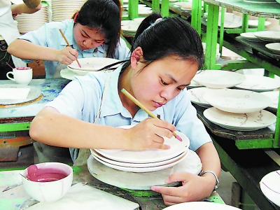 德化陶瓷企業(yè)的彩繪工們正專心致志地工作。
