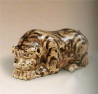整體造型呈趴狀的猛虎,豐肩碩臀,腰部背脊平緩微凹,虎頭俯貼于前爪之上,后爪蜷于腹下,虎尾緊緊收攏,雙耳直立,耳孔前傾,眉骨隆起,張目合唇,眼點(diǎn)定在雙目?jī)?nèi)側(cè),窺視前方,粗紅缸胎,胎質(zhì)堅(jiān)硬,掛白色化妝土,滿(mǎn)繪鐵彩虎斑紋,施微微泛青色的白釉。