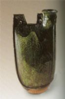 扁體高身,管狀口,唇沿,馬鞍狀雙孔系,圓底內凹。紅陶胎,胎質細膩,上白色化妝土,施深綠色釉,底足無釉。