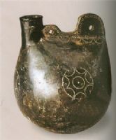 壺體仿皮囊形,上圓下扁,上有管狀口和馬鞍狀雙孔,壺身滿掛綠釉,器胎很像用一圓球捏扁上部制作而成。在馬鞍狀雙孔處,飾有縫合針腳,并劃有橫排五個(gè)半圓形紋飾。