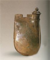 扁體高身,管狀口,塔式蓋上施寶珠鈕,馬鞍狀雙孔系,橢圓形底內(nèi)凹,淡紅色陶胎,上白色化妝土,滿施綠色低溫鉛釉,底無(wú)釉。兩側(cè)飾貼仿皮條裝飾并附有縫合痕跡,雙面劃葡萄紋,紋飾精巧別致,雙孔飾劃旋渦紋。