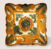 碟作方形,侈口,曲邊,平底。內(nèi)壁以模印的條紋將之分為八組,每組內(nèi)各印一朵花卉及卷云紋,碟心印一大朵團菊花,四角飾葉,施黃、白、綠三色釉彩,外部施半釉。此器制作規(guī)整,成型較難,其斑斕的色釉,加之器內(nèi)模印的凸花紋飾,愈顯出器物的精美。
