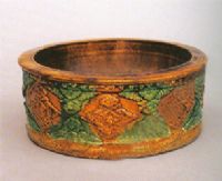 盤(pán)敞口,寬折沿,淺腹,圓筒形高座,平底。淡黃色陶胎,較堅(jiān)硬,上白色化妝土,內(nèi)施黃釉,座外壁施黃、綠兩色釉。